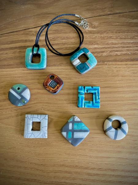I also make jewelry pieces and ornaments with beautiful shiny tones, crackle glazes or horse hair in a Raku fire. Raku is truly a favorite of mine because it’s total hands on. The firing is done outside in a semi controlled atmospheric environment. This process relies on the kiln temperature, weather and temp that day, combustibles used, and amount of smoke in the can. It’s like a gift at every firing!